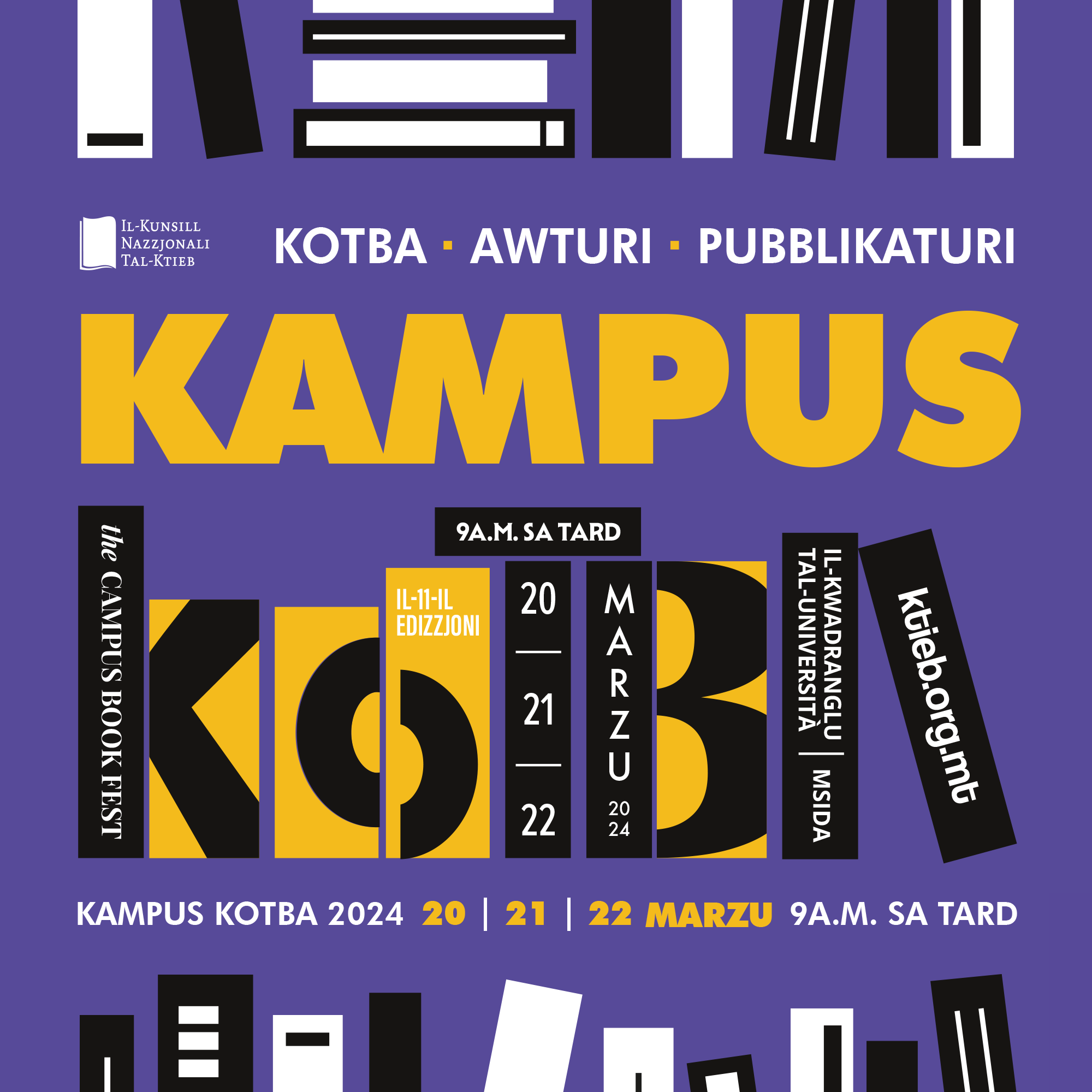 Home / News / The Campus Book Festival: Revealing the dates and official poster Back to News The Campus Book Festival: Revealing the dates and official poster Campus Book Festival • Festivals • News 26th January, 2024 The National Book Council is pleased to announce that this year’s edition of the Campus Book Festival, also known as Kampus Kotba, is taking place between Wednesday 20 and Friday 22 March at the University of Malta Quadrangle. Calling all book enthusiasts! This edition’s official poster was designed by the graphic designer Sarah Cachia Falzon. The book spines reveal the key plot points of Kampus Kotba! Don’t miss the Campus Book Festival, a collaborative effort between the National Book Council, student organisations and University departments. You’ll find everything you’d expect from a book festival: the best local publishers under one roof, new books in various genres, and an exciting lineup of events. Immerse yourself in the literary excitement! The opening hours are Wednesday to Thursday from 9am to 4pm, and Friday between 9am and 7pm. Stay tuned for the programme! Visit www.ktieb.stagingcloud2.co or the NBC Facebook page or the Kampus Kotba 2024 Facebook page for more information. SHARE POST Related Articles The National Book Council has rebranded! News 5th March, 2025 Read More Call for Delegates: Malta Named Focus Country for the 2025 Mediterranea Publishing Fellowship Initiatives 28th February, 2025 Read More The National Book Council at the 2025 London Book Fair News 25th February, 2025 Read More NBC and Wikimedia Malta announce Wikimedians in Residence for National Book Prize Project News 20th February, 2025 Read More National Book Prize 2025 – Applications Are Open National Book Prize 17th February, 2025 Read More NBC empowers local stakeholders at the London Book Fair 2025 Literary Exports 11th February, 2025 Read More The NBC’s Annual Report For 2024 News 4th February, 2025 Read More Festivals, Funds And Initiatives In 2025: Key Dates Festivals 29th January, 2025 Read More Join the NBC at the London Book Fair 2025: Guest Passes for NBC stakeholders from Malta Literary Exports 13th January, 2025 Read More Kirsten Spiteri wins the Novels for Youth Literary Contest 2024 Literary Contests 13th January, 2025 Read More view all similar news